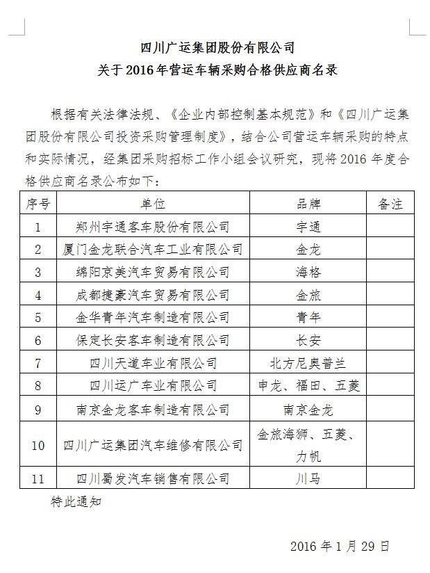 四川廣運集團(tuán)股份有限公司關(guān)于2016年營運車輛采購合格供應(yīng)商名錄