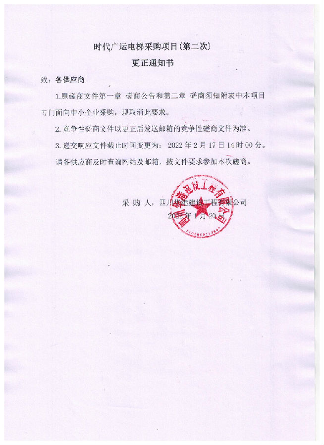 時(shí)代廣運(yùn)電梯采購項(xiàng)目(第二次)更正通知書